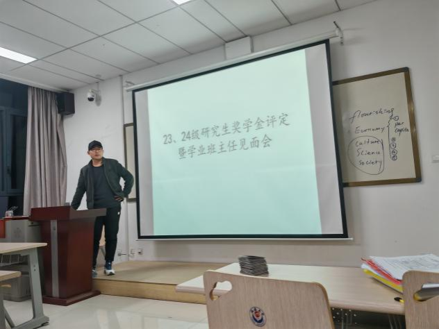 公司23、24级中国史班于2024年11月27日19点在公司509教室举行了2024年度学业奖学金评定暨学业班主任见面会。辅导员李生策老师、24级学业班主任白中阳老师以及23级、24级全体研究生同学参加。