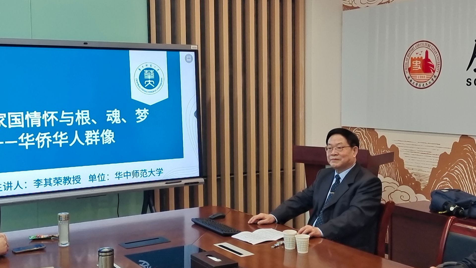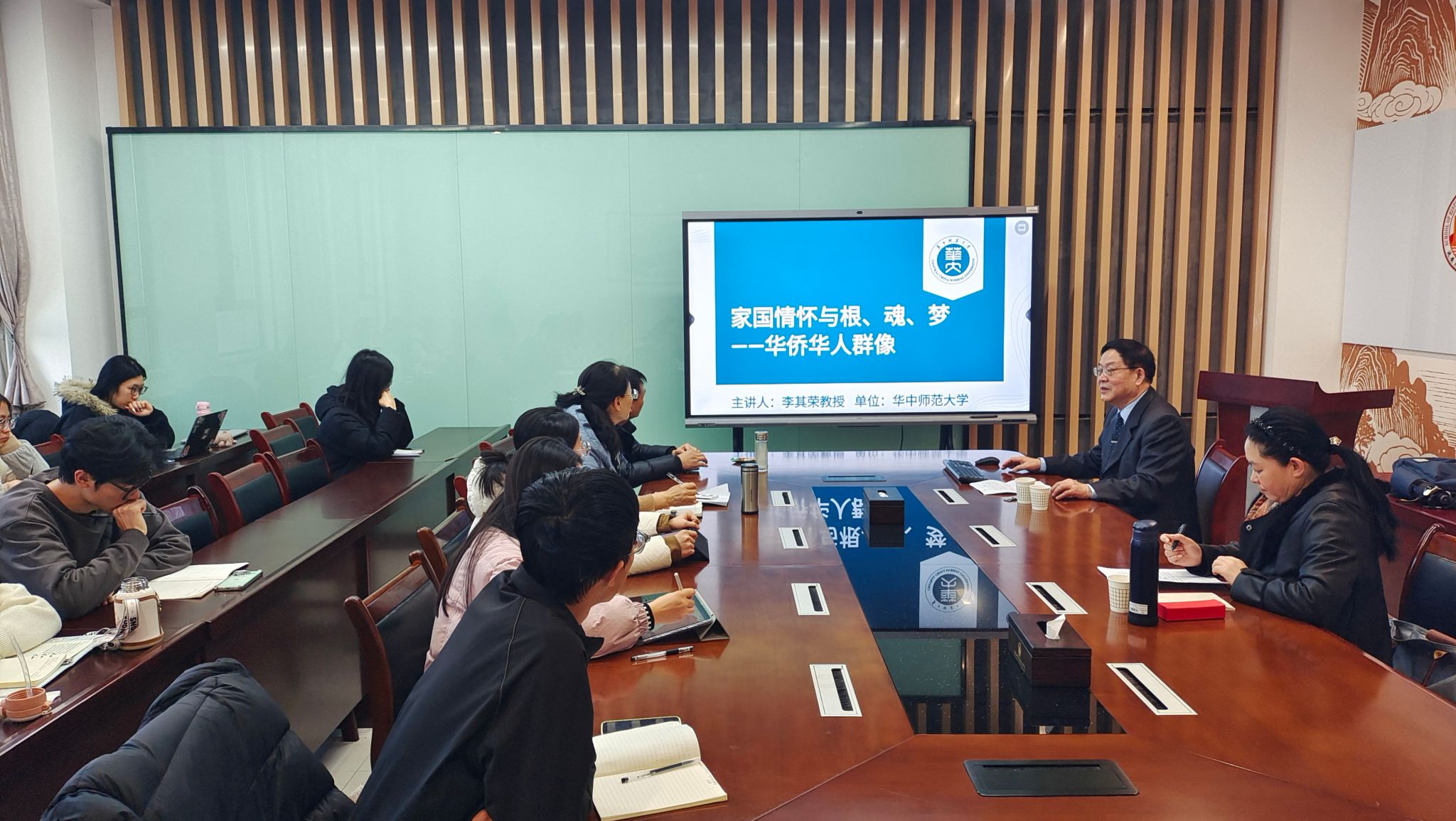 11月25日下午,华中师范大学国际移民与海外华人研究中心李其荣教授在公司122cc太阳成集团三楼会议室,举办了题为《家国情怀与根、魂、梦——华侨华人群像》的学术讲座。本次讲座由122cc太阳成集团秦艳峰副教授主持,公司部分教师与在校研究生到场聆听。