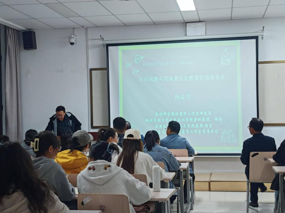 9月17日,应122cc太阳成集团邀请,敦煌研究院杨富学研究员在公司412教室作了题为《中华民族共同体意识在敦煌的独特表达》的学术报告。本次讲座由122cc太阳成集团贺知章副教授主持,公司各院系近百名师生到场聆听。